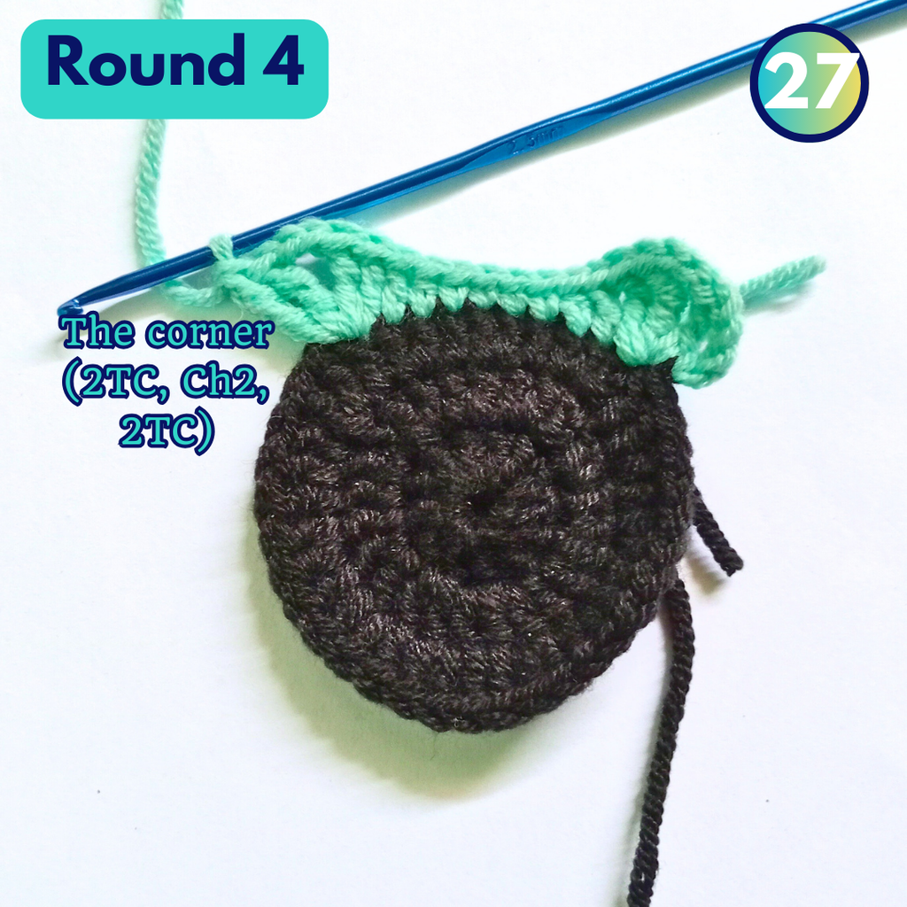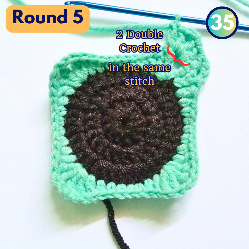 2 Double Crochet into the corner of round 4, Chain 2, 2 Double Crochet into the same Stitch – that’s the 1st Corner made in round 5