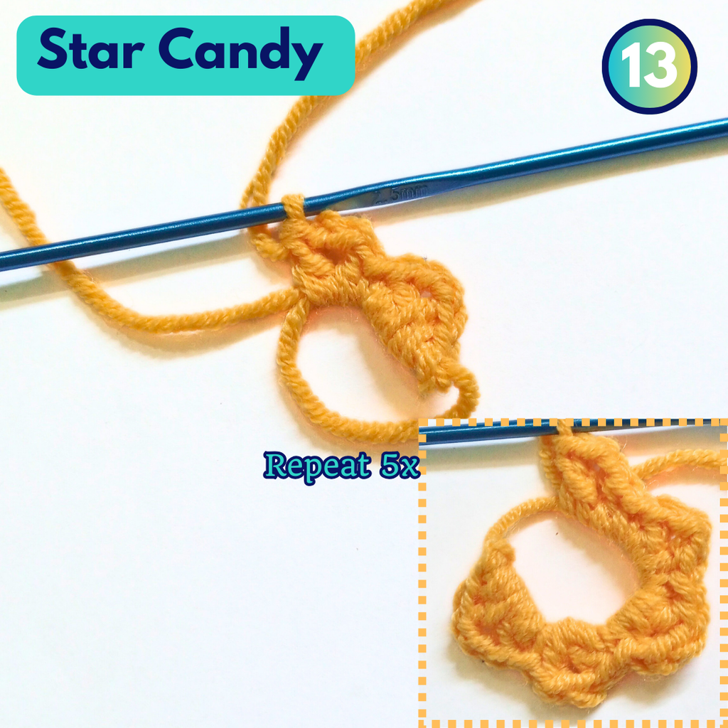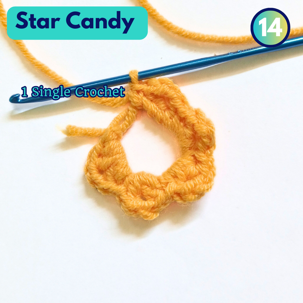1 Single Crochet, 1 Double Crochet, Chain 2, 1 Double Crochet –Â Repeat 5x